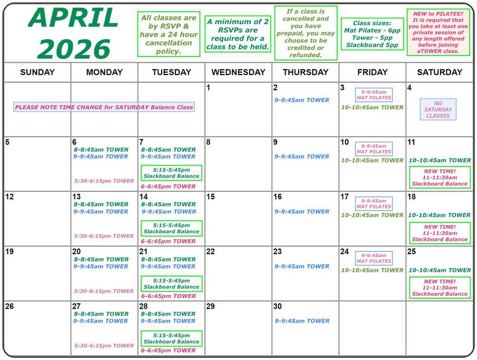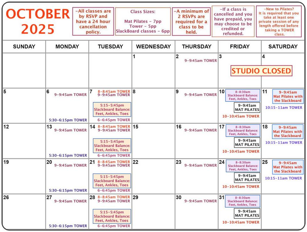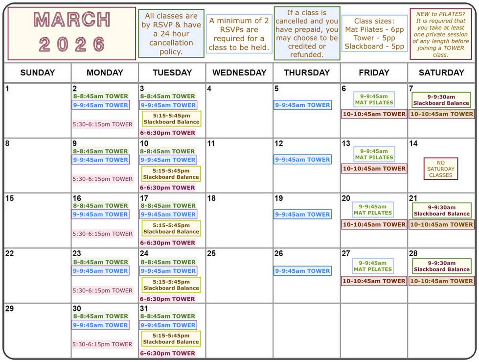 TOWER, MAT PILATES, or SLACKBOARD CLASSES